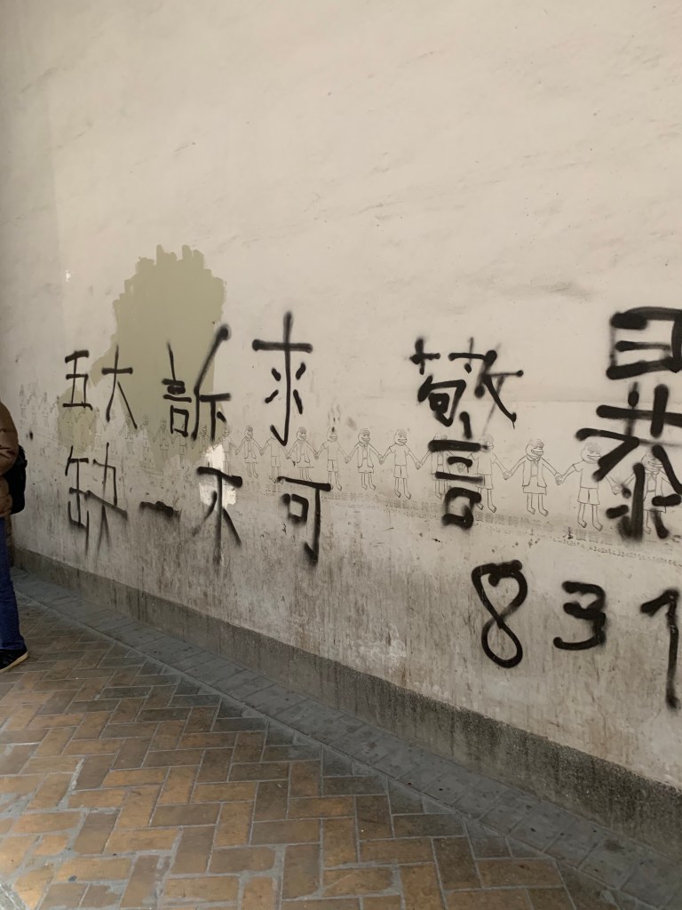 市民が主張する五大要求の落書き。人々が手を携えている。ジョン・レノンの名前を取って、レノン・ウォールと呼ばれる場所